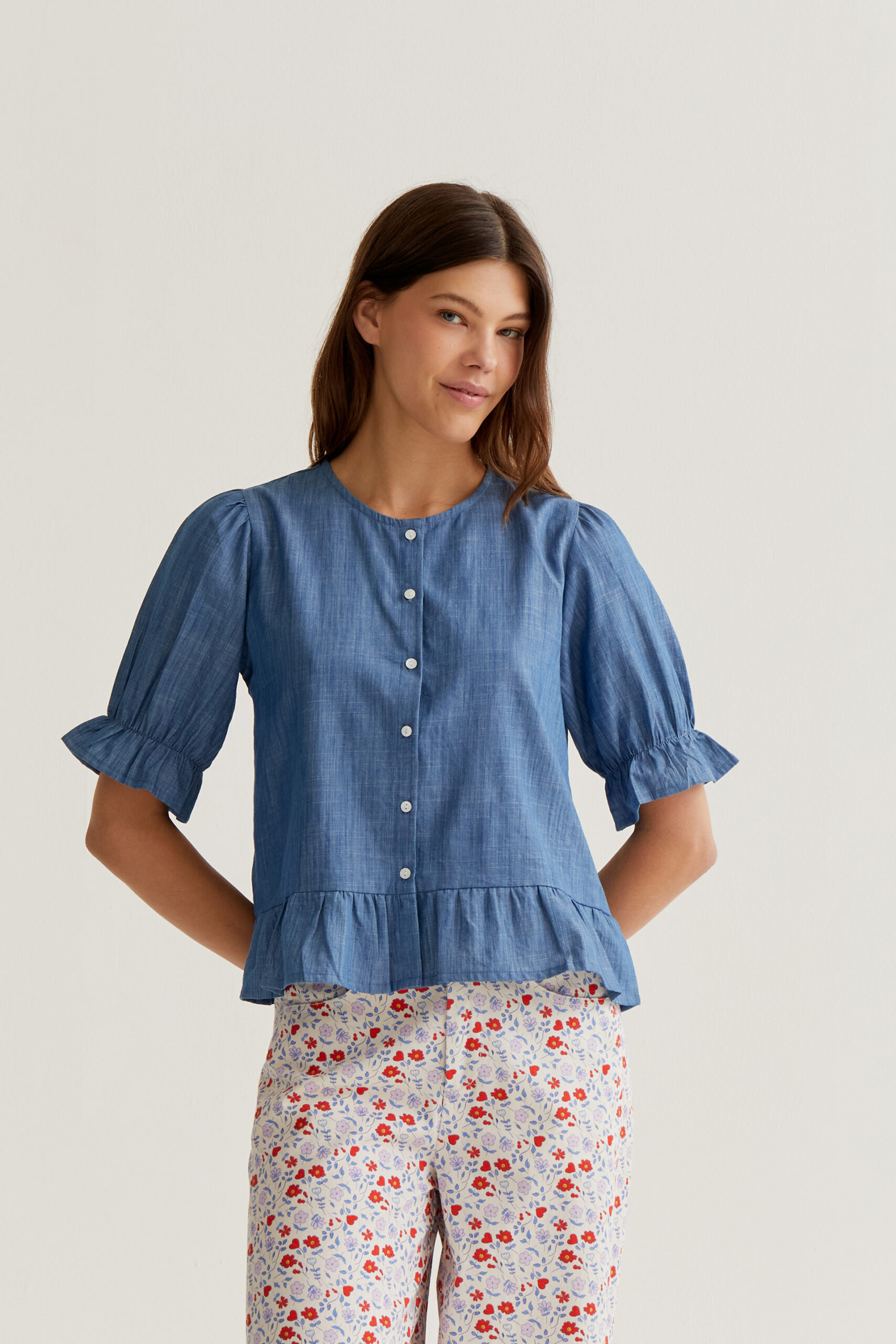 Camisa chambray azul confeccionada en 100% algodón. Diseño de cuello redondo con manga 3/4 ligeramente abullonada, puño elástico con volante y cierre frontal con botones blancos. Ligera, transpirable y con bajo acabado en volante, es una prenda versátil y femenina ideal para looks frescos y actuales.