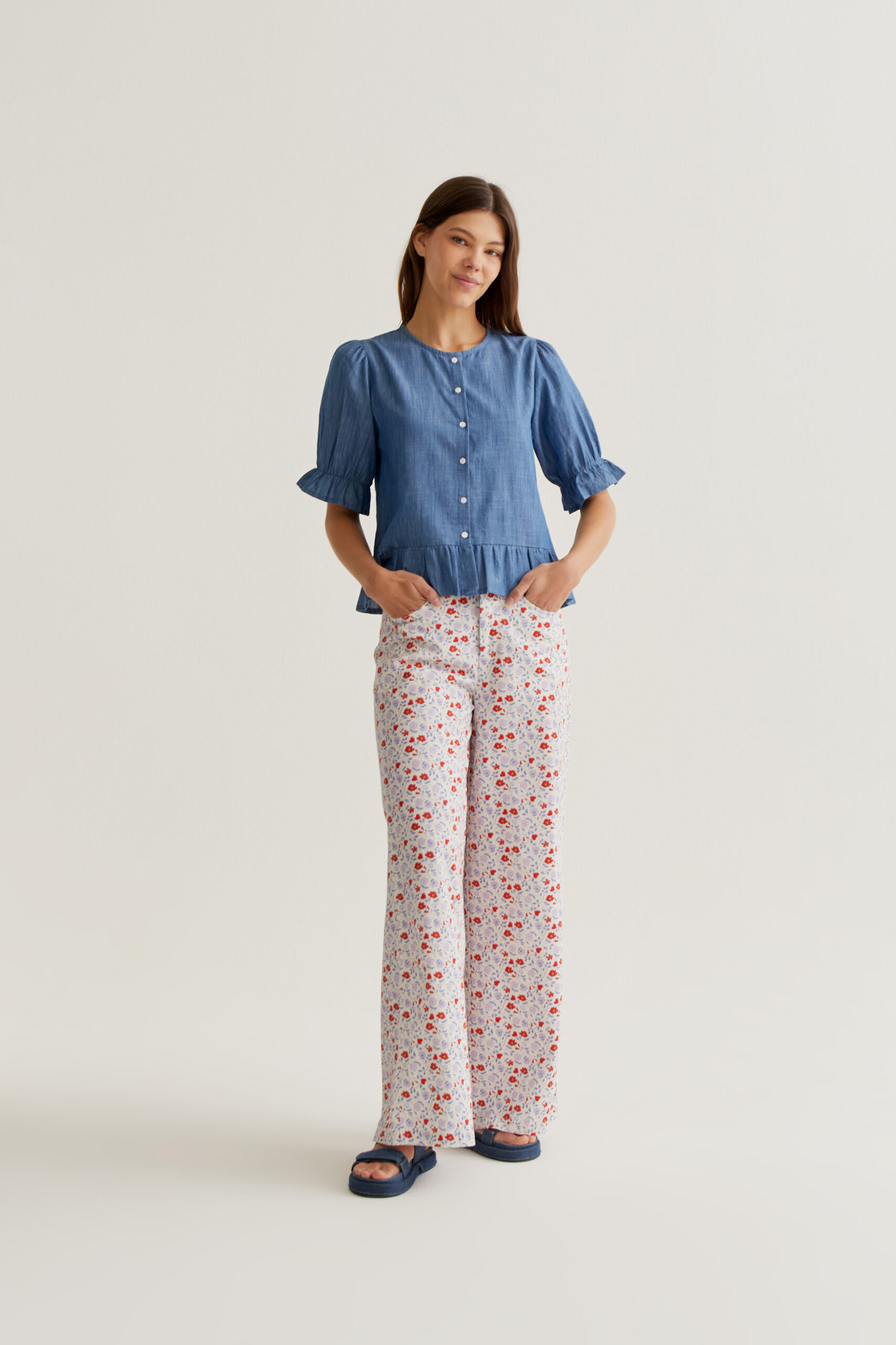 El cierre frontal con botones blancos aporta contraste y luminosidad al azul chambray, reforzando su estética fresca y versátil. Además, el detalle de volante en el bajo añade movimiento y un acabado fluido que estiliza la silueta y permite llevarla tanto por fuera como parcialmente por dentro.