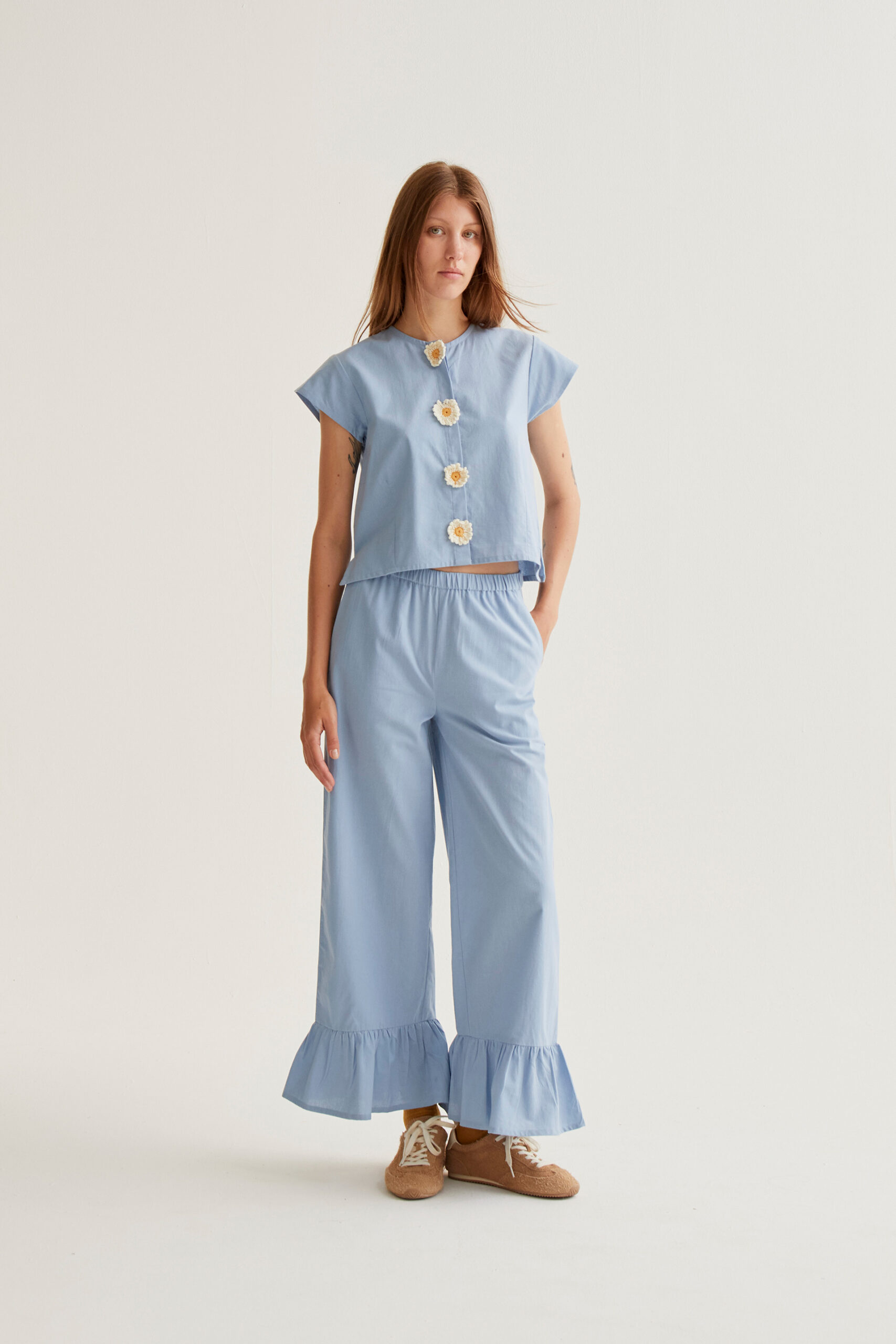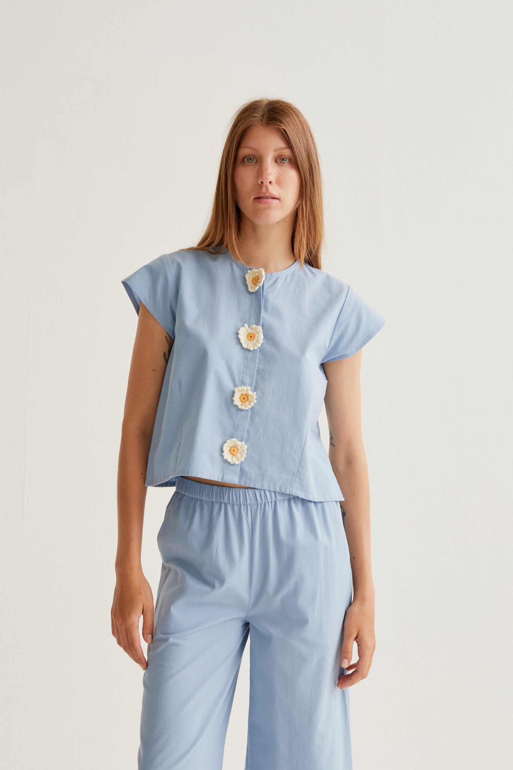 Incorpora la camisa margaritas azul claro a tu colección y disfruta de una prenda cómoda, femenina y con un delicado detalle artesanal que eleva cualquier outfit.