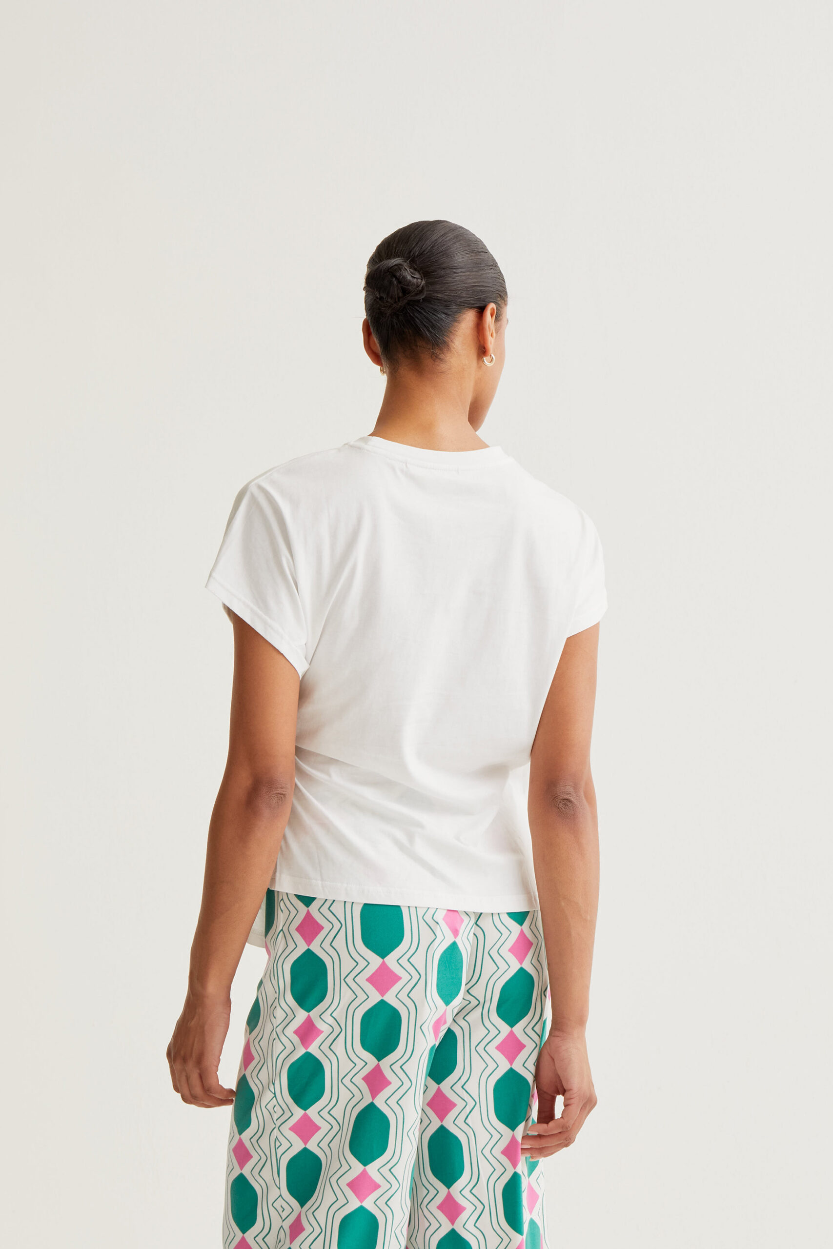 La camiseta básica con nudo lateral es la prenda imprescindible que eleva cualquier look diario con un detalle sutil pero diferenciador. Su diseño en color blanco, atemporal y versátil, se actualiza gracias al drapeado en la cintura que culmina en un elegante nudo lateral, aportando forma, movimiento y un favorecedor efecto estilizador.