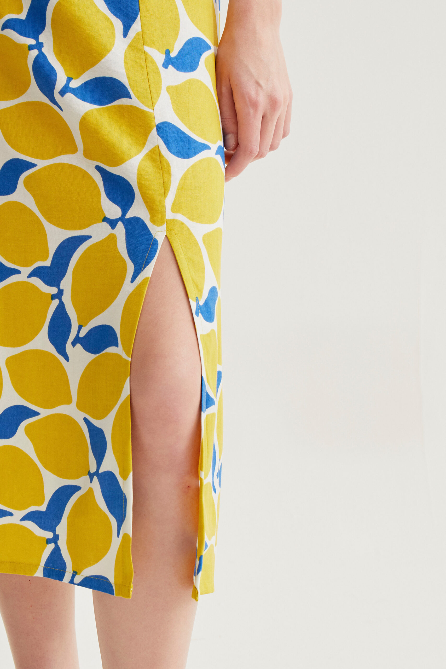 Falda midi con estampado limoncello en tonos amarillos y azules. Diseño de tiro alto con cintura fija elástica y ligera abertura lateral que aporta movimiento y feminidad. Confeccionada en 95% poliéster y 5% elastano, es cómoda, ligera y perfecta para looks frescos y versátiles de temporada.