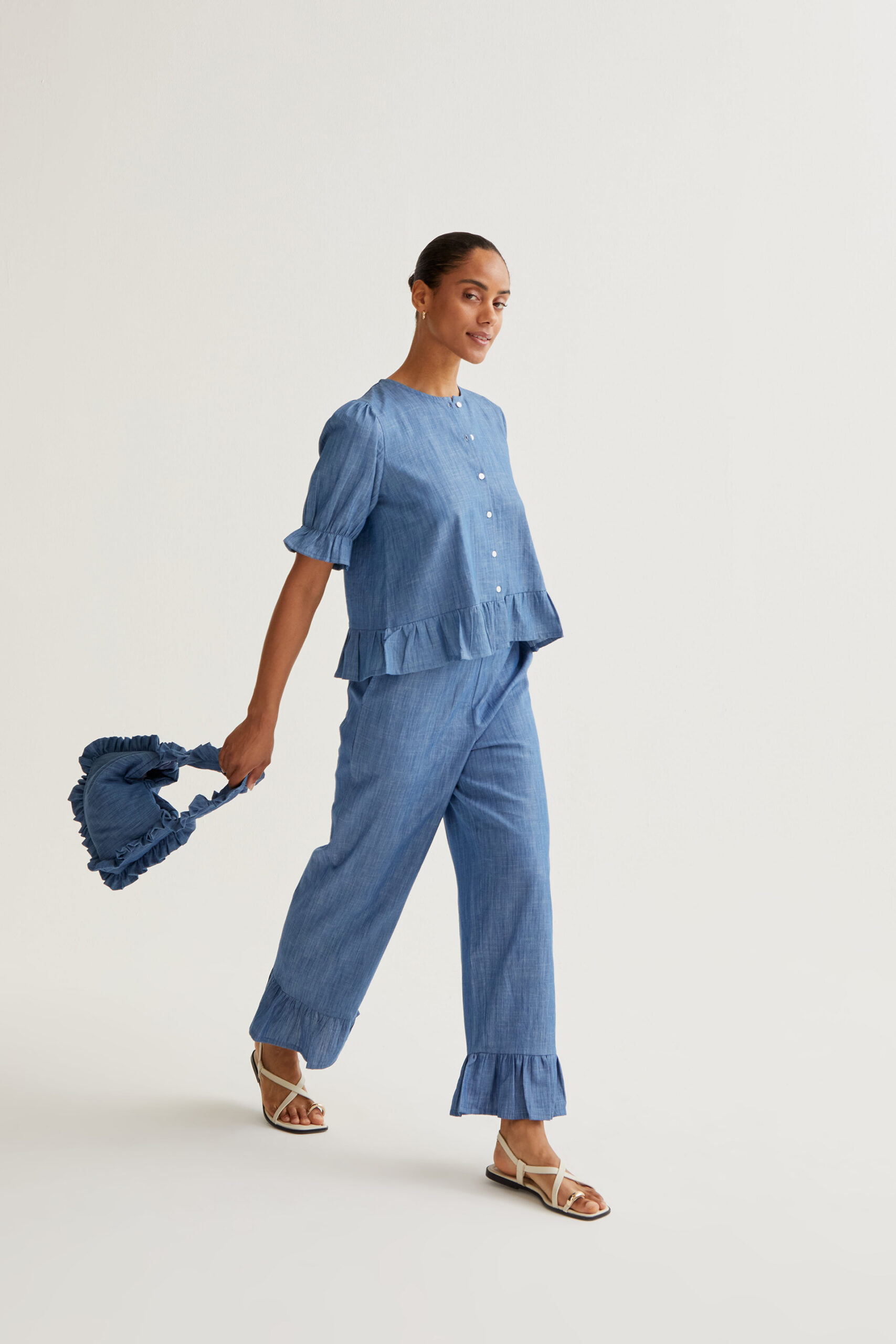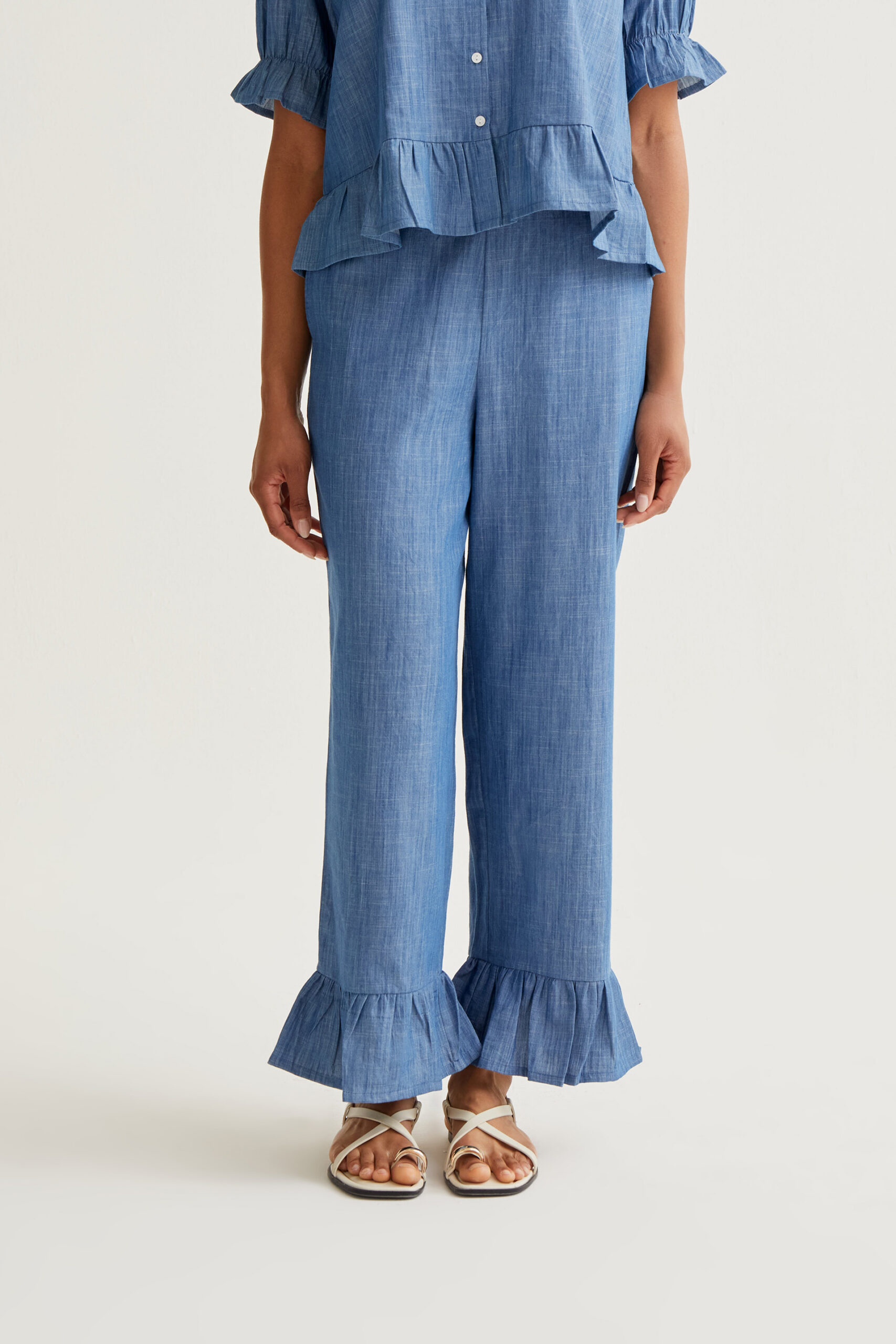 Pantalón chambray azul confeccionado en 100% algodón. Diseño de tiro alto con cintura fija elástica y pernera recta amplia que aporta comodidad y caída fluida. Detalle de volantes en el bajo para un toque femenino y actual. Ligero, transpirable y versátil, ideal para looks casuales con estilo.