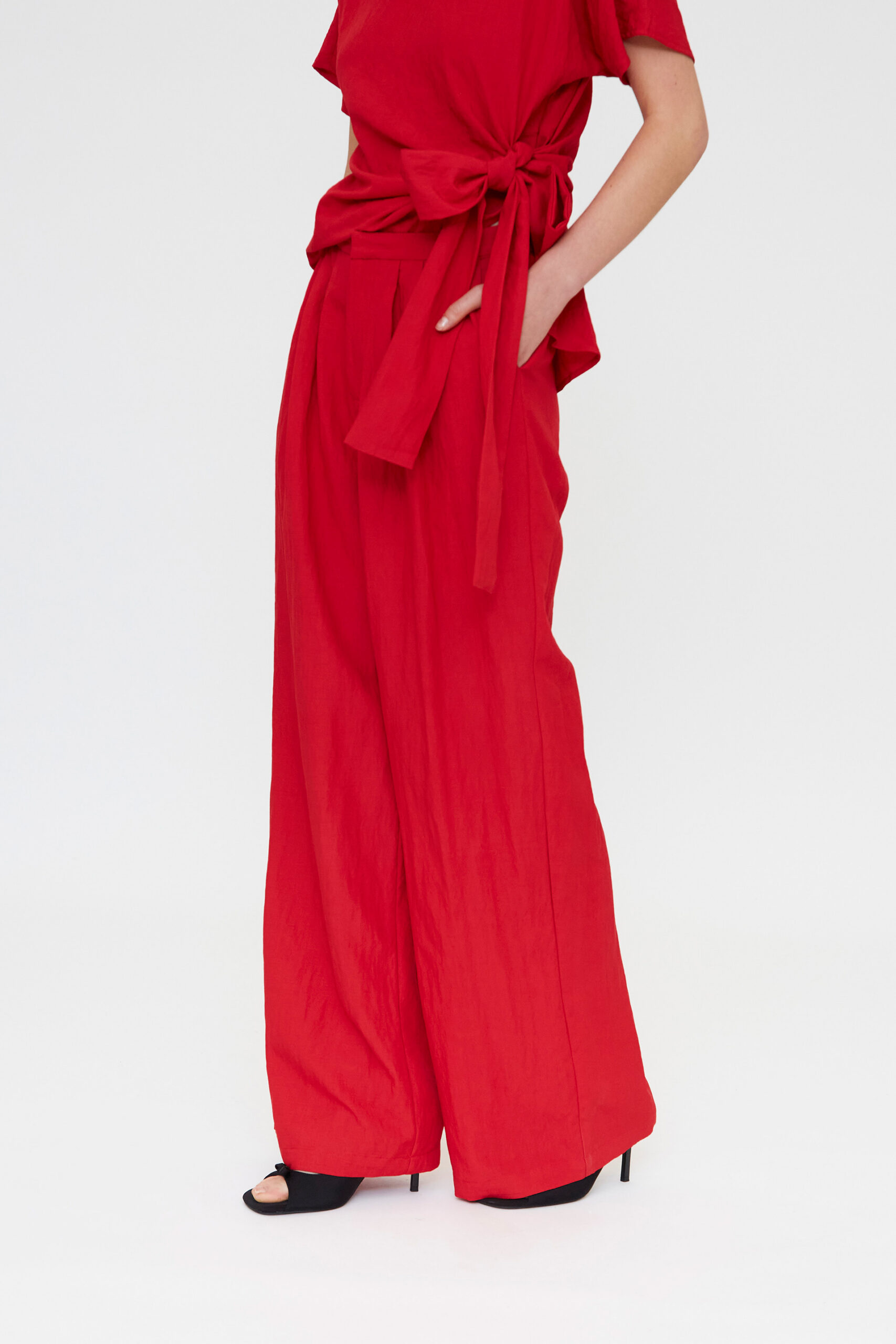 El intenso color rojo potencia la presencia de la prenda, transmitiendo seguridad y carácter. Es una opción perfecta tanto para estilismos coordinados como para combinar con blusas, tops o chaquetas estructuradas.