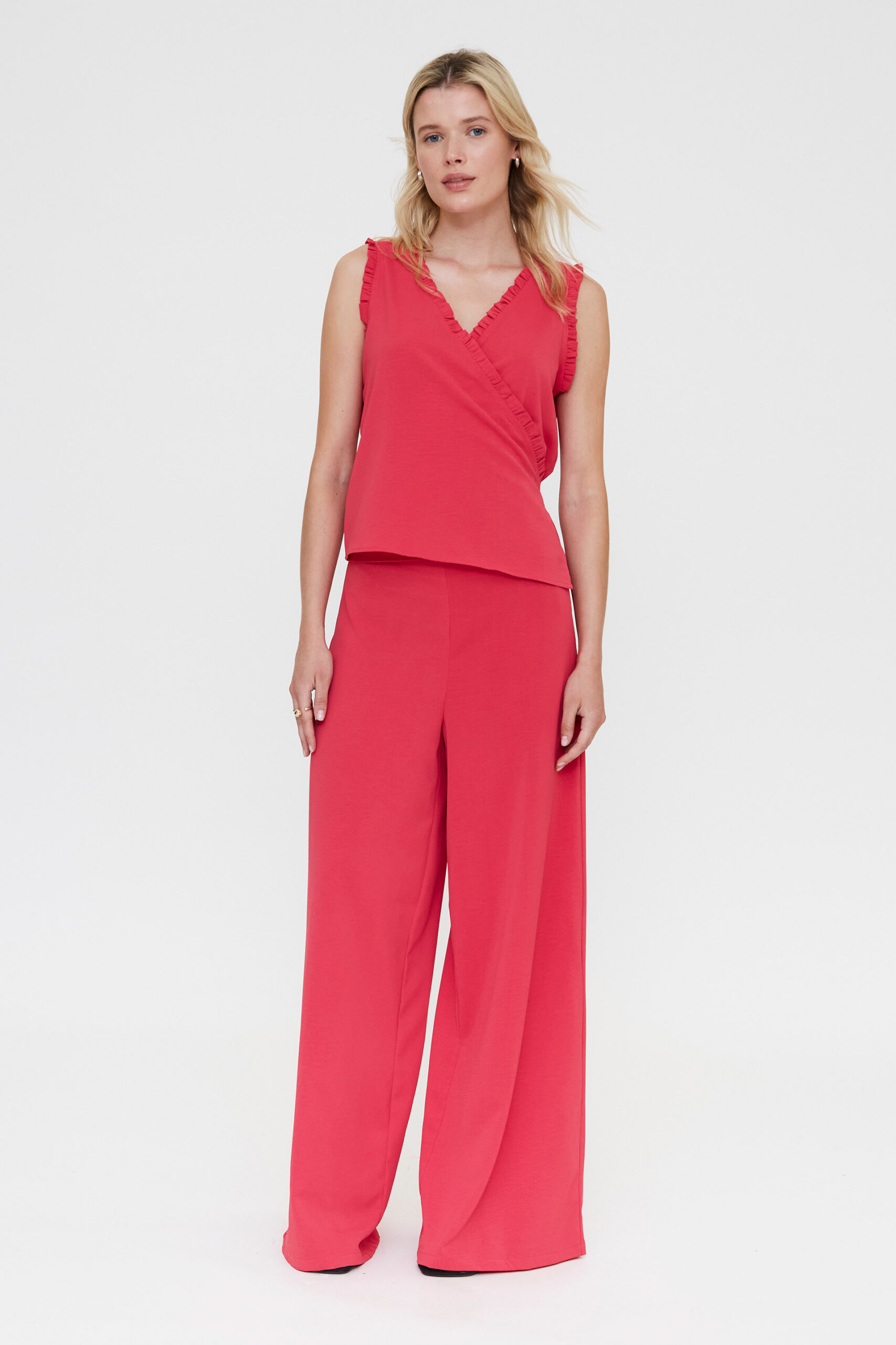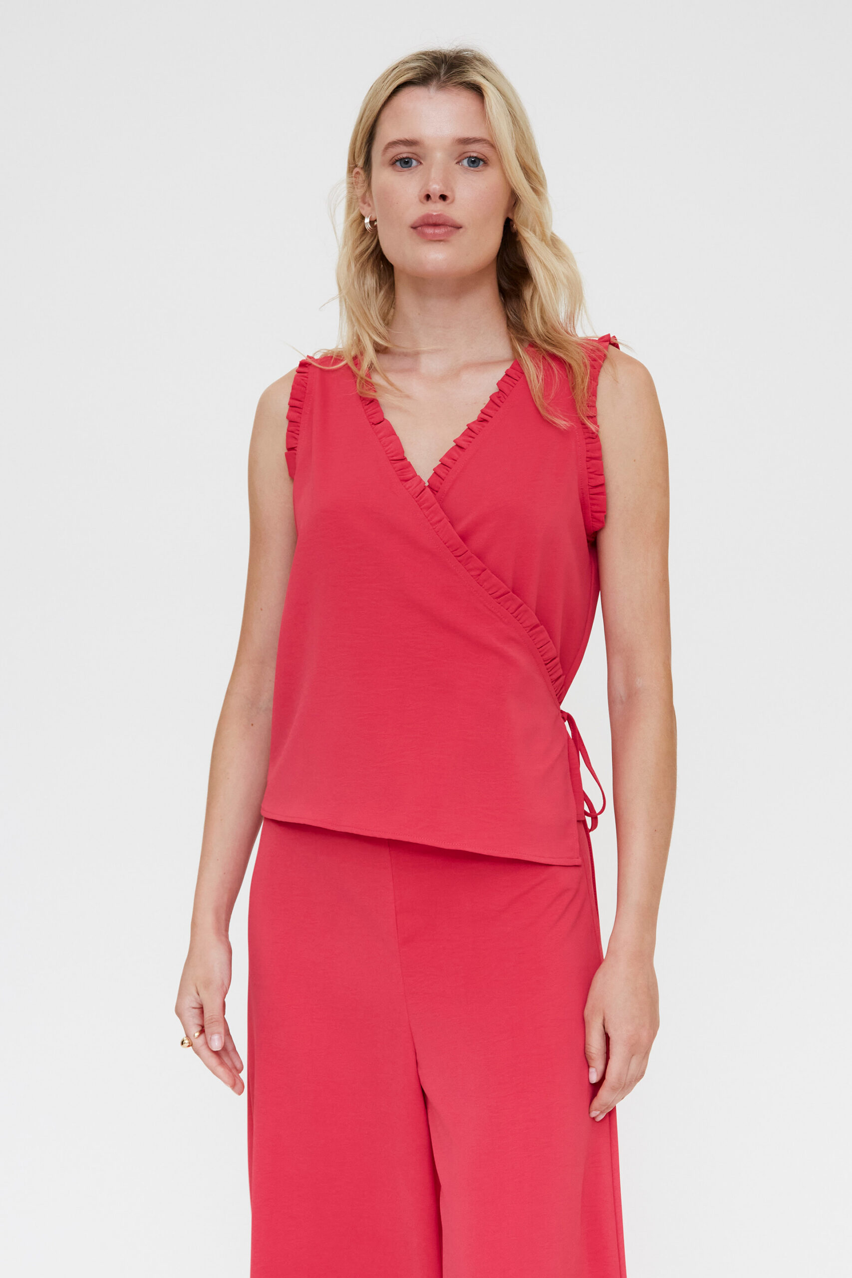 Top fucsia en 100% crepé con escote pico y diseño sin mangas. Presenta corte asimétrico con ajuste lazado en la cintura y delicados volantes que aportan un acabado femenino. Su caída fluida y silueta envolvente lo convierten en una opción elegante para eventos o looks sofisticados de temporada.