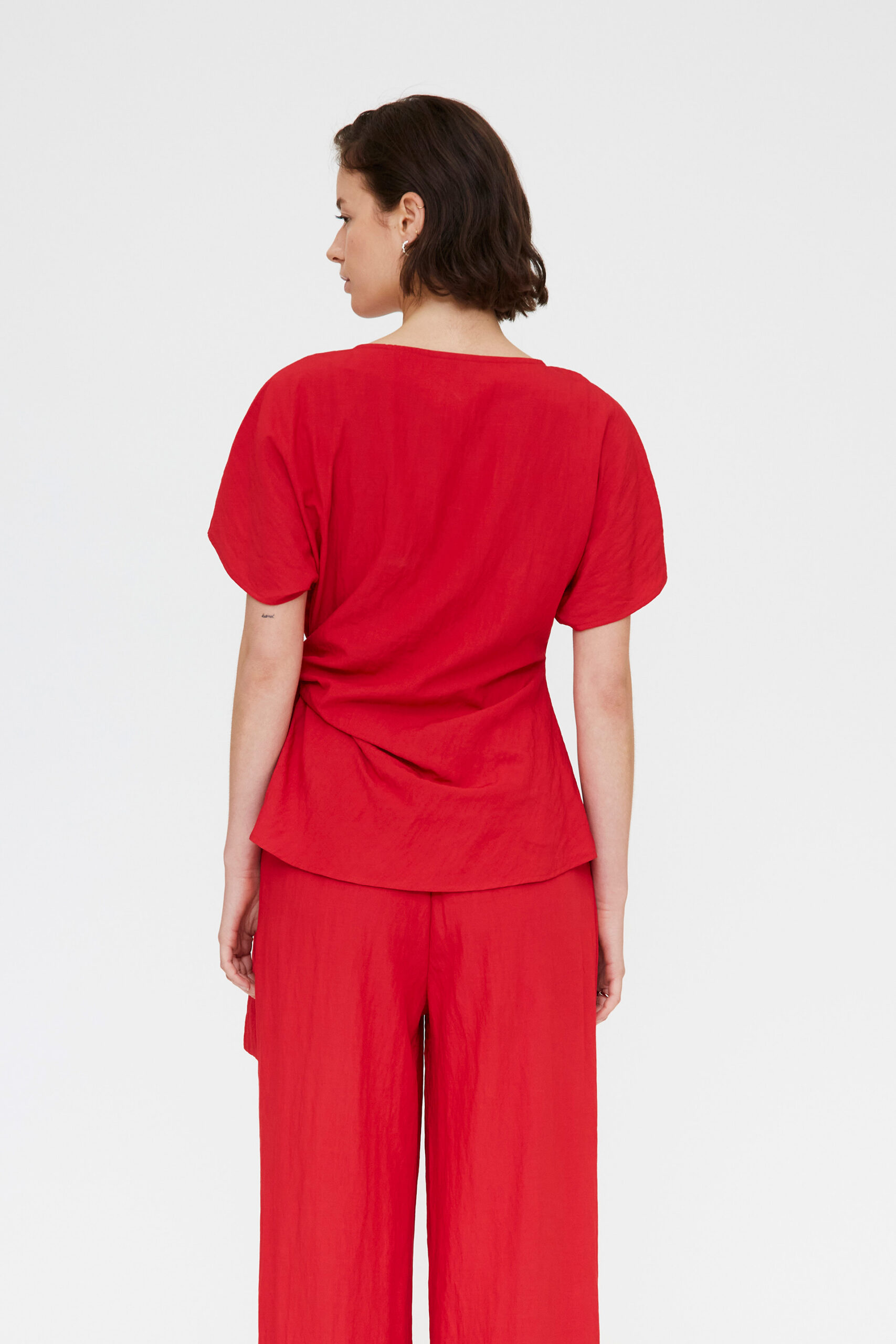 Top rojo en tejido 100% crepé con cuello redondo y manga corta. Incorpora detalle lateral drapeado con lazo que estiliza la silueta y aporta un acabado sofisticado. Su caída fluida y diseño versátil lo convierten en una prenda ideal para eventos, oficina o looks elegantes con personalidad.