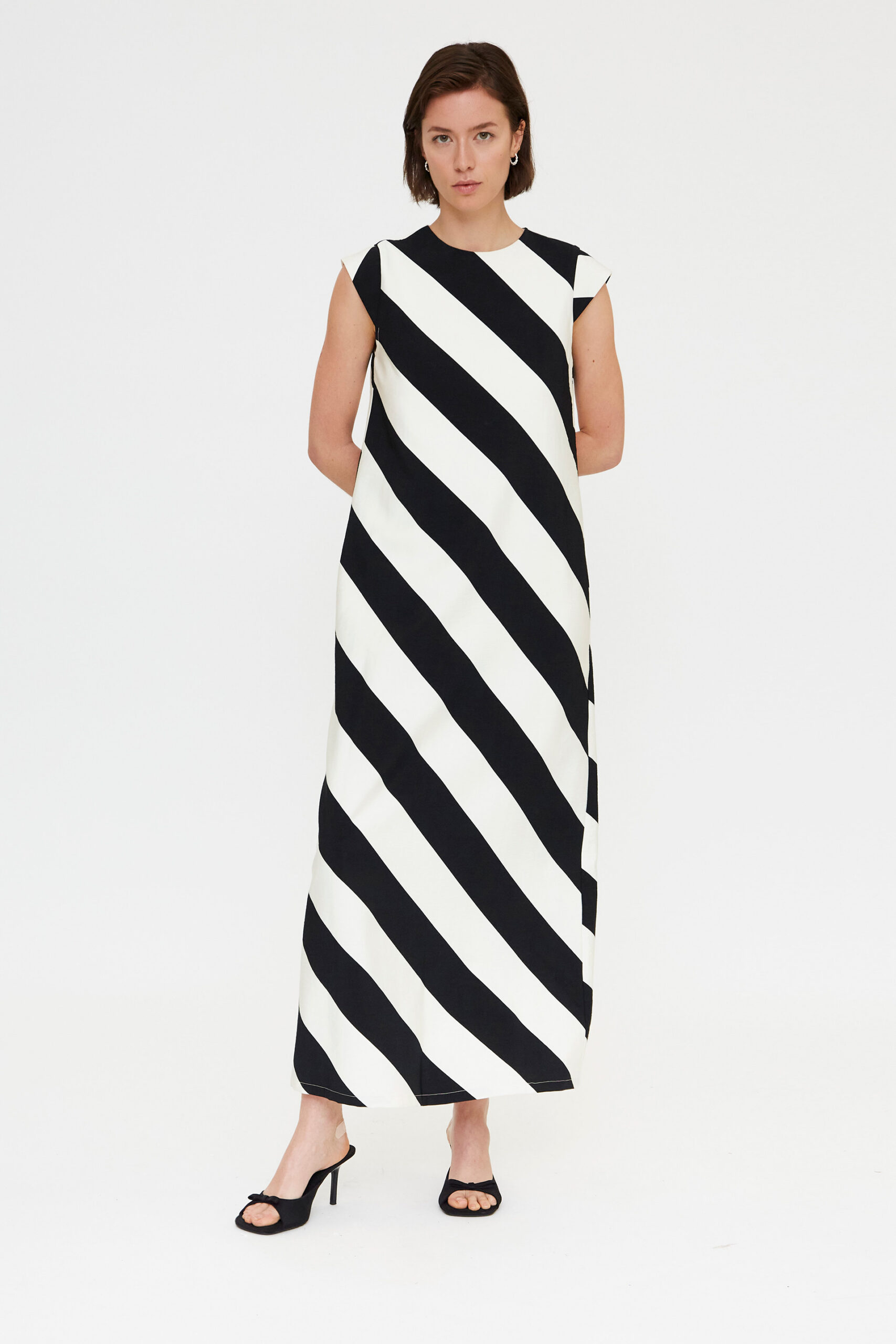 Este vestido largo de rayas diagonales es la combinación perfecta entre diseño contemporáneo y elegancia clásica. Confeccionado en tejido 100% crepé en contraste negro y blanco, destaca por su caída fluida y su estructura ligera, aportando movimiento y presencia en cada paso.