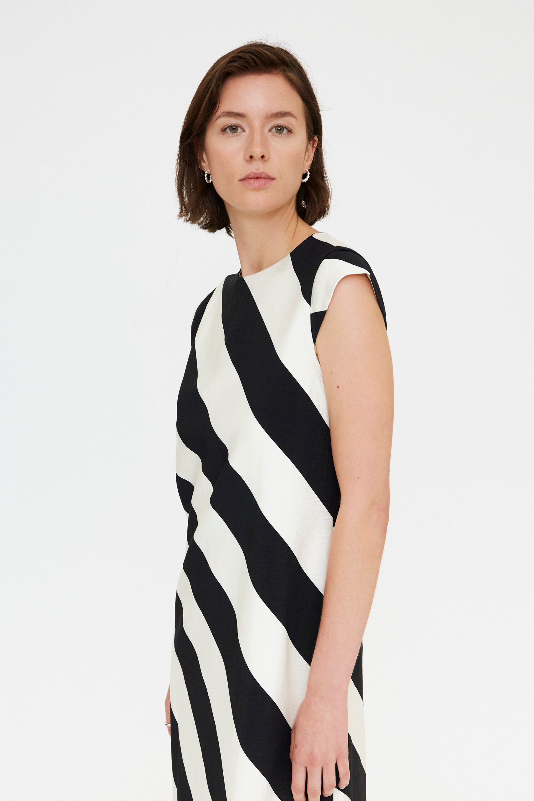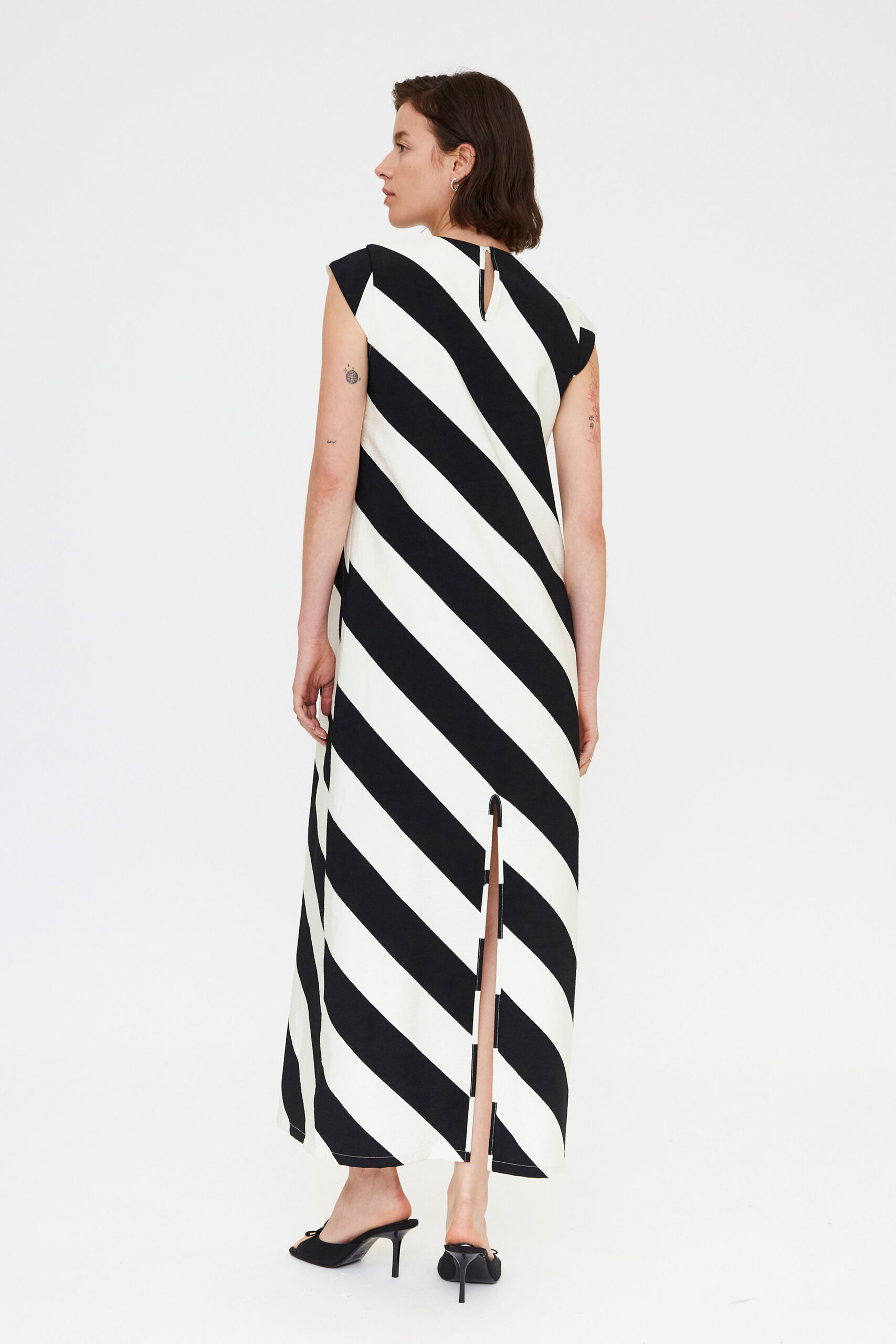 El estampado de rayas diagonales estiliza visualmente la silueta, creando un efecto dinámico que alarga la figura. Su cuello redondo y manga corta aportan equilibrio y versatilidad, permitiendo adaptarlo tanto a eventos formales como a estilismos más relajados. El cierre posterior con botón oculto mantiene una estética limpia y depurada, mientras que la abertura trasera facilita el movimiento y añade un toque sutilmente femenino.