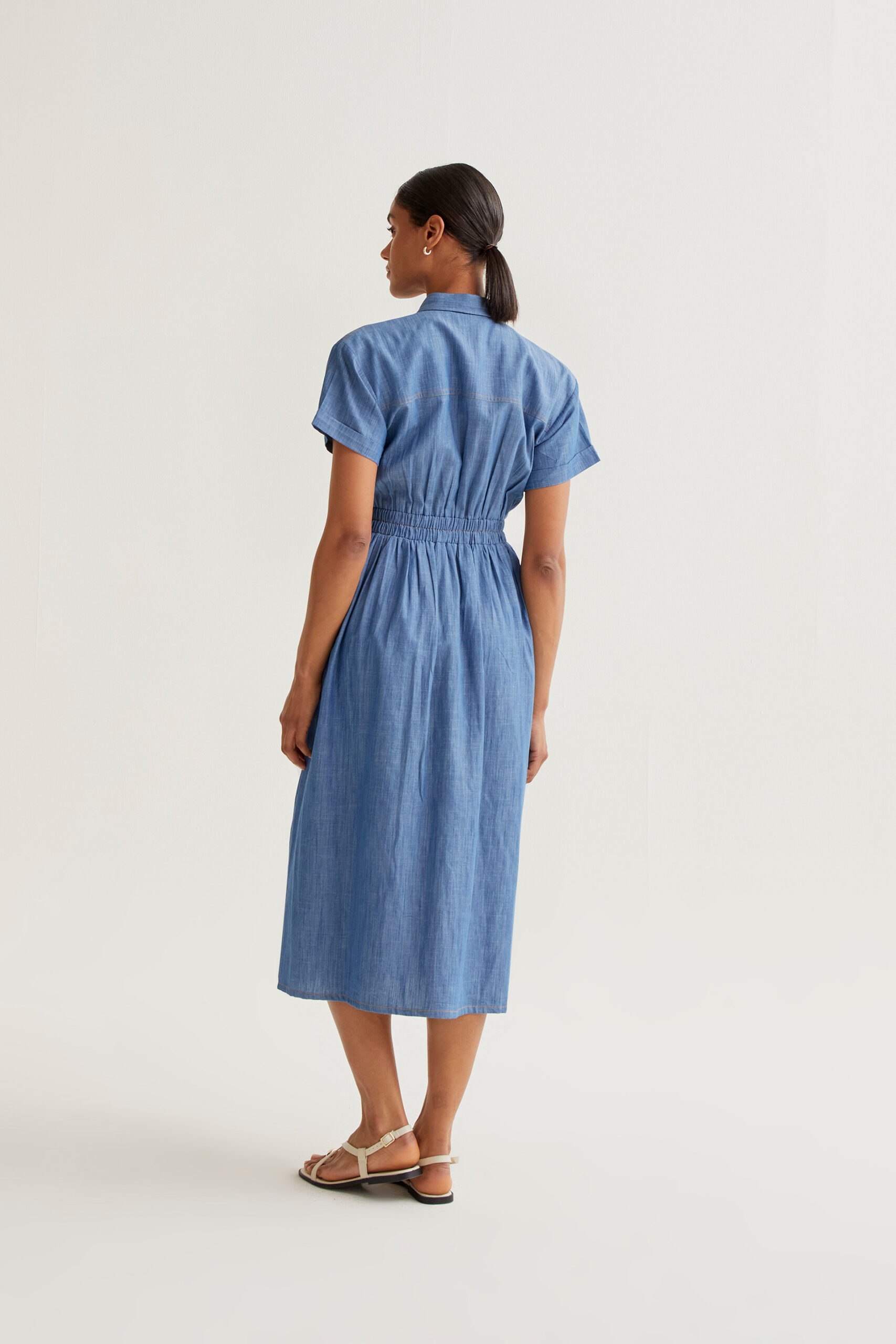 Vestido midi chambray confeccionado en 100% algodón. Diseño camisero con cuello de solapa, manga corta con vuelta y cierre frontal con botones ocultos. Cintura elástica que estiliza la silueta y bolsillos laterales prácticos. Cómodo, ligero y versátil, perfecto para looks casuales con un toque sofisticado.